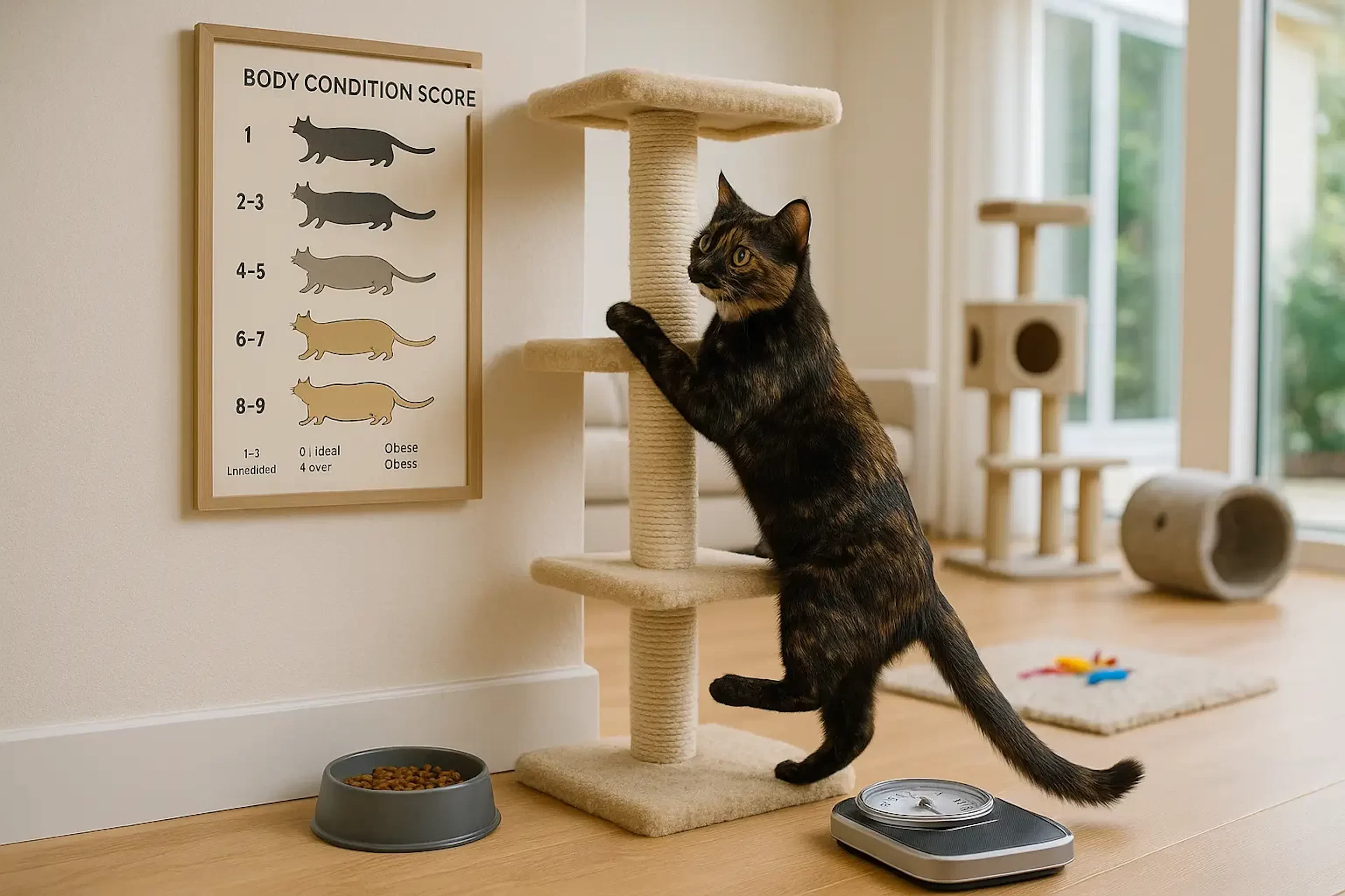 Understand your cat's Body Condition Score (BCS) and learn how to assess weight, adjust dry food portions, and support long-term feline health